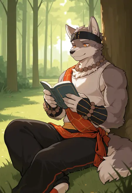 提示词1:triratna,狼男孩,狼尾(白色背心、黑色头带、珠串项链、珠串手链、黑裤子、红腰带)