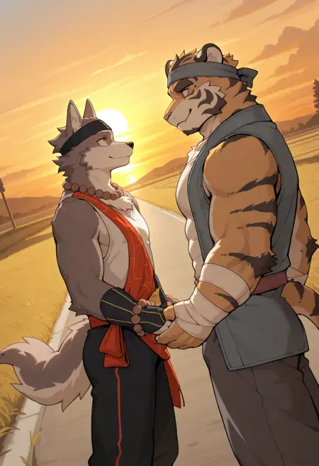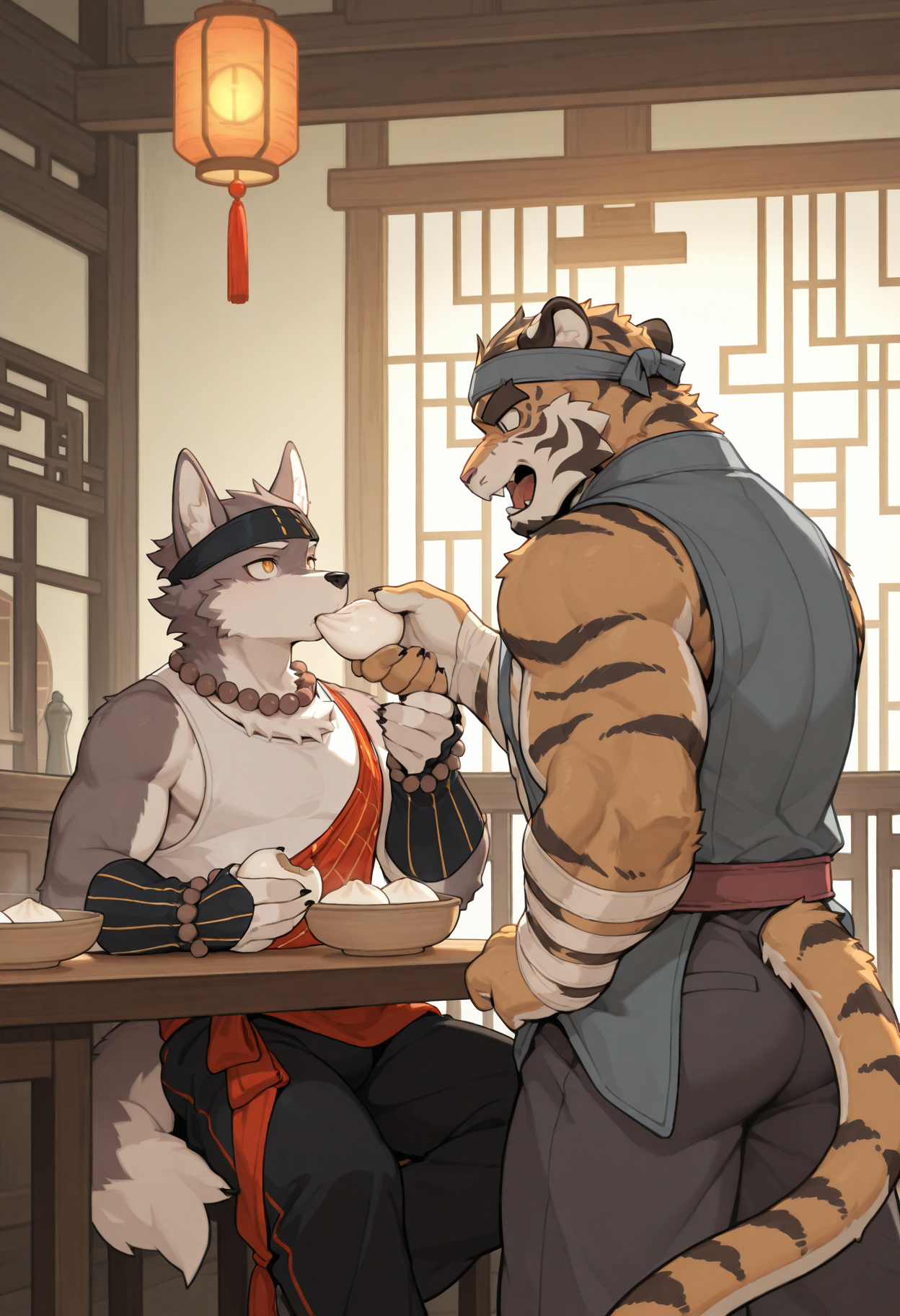 提示词2:betnone,虎男孩,虎尾(灰色头带、敞开的背心、缠布裹手、纱布缠腰)