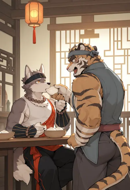 Prompt 1: triratna, wolf boy (タンクトップ、帯、ズボン)