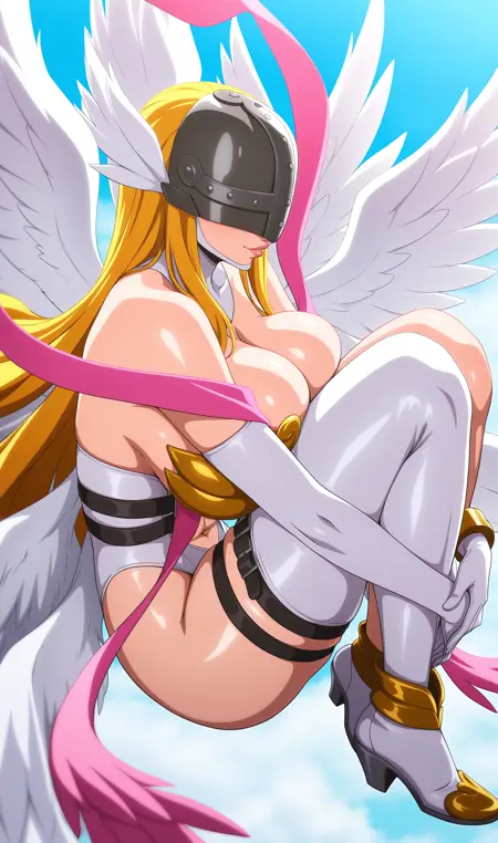 angwmn, 금발, 성숙한 여자, 긴 머리, 눈가린, 날개 달린 헬멧, 머리 날개, 천사 날개, 흰 날개, 여러 개의 날개, 깃털 날개, 덮인 어깨뼈, 허벅지 스트랩, 배꼽 절개, 의상 절개, 비대칭 옷, 스카프, 하고로모, 벨트, 가슴 노출, 어깨 노출, 팔꿈치 장갑, 흰 신발, 부츠, 피부 함몰, 깊은 피부,