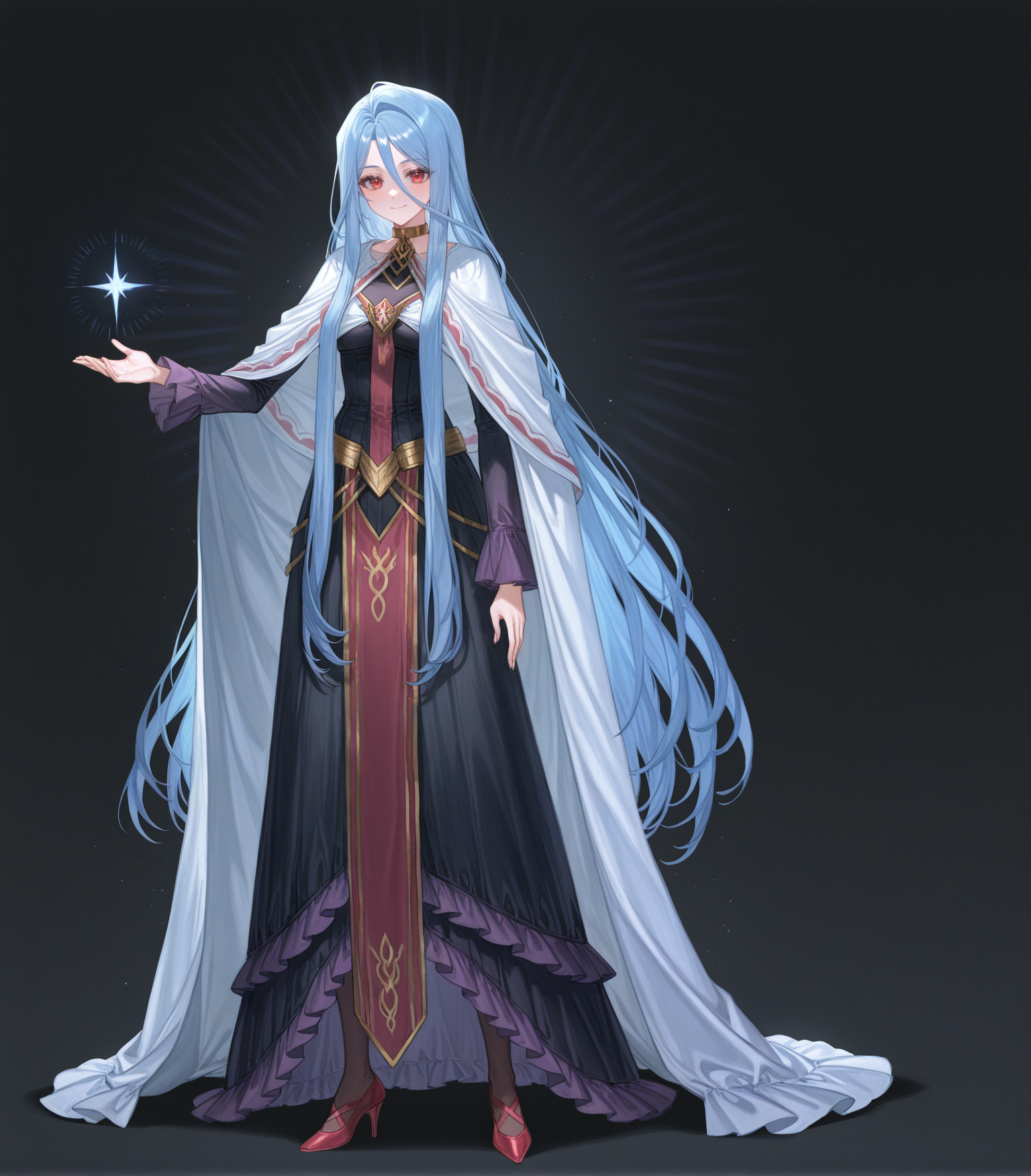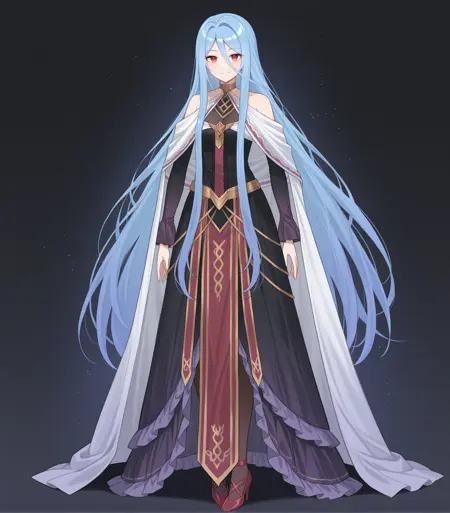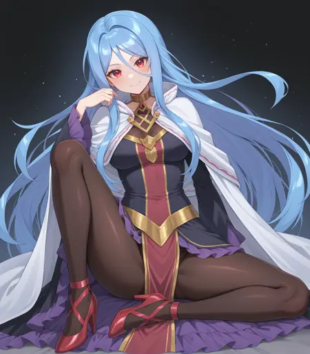 <lora:Grandmaster_Illustrious:1>, Grandmaster, blue hair, long hair, very long hair, red eyes, medium breasts, white shawl, white cloak, black dress, long sleeves, ruffles, jewelry, choker, pantyhose, red high heels, pelvic curtain,