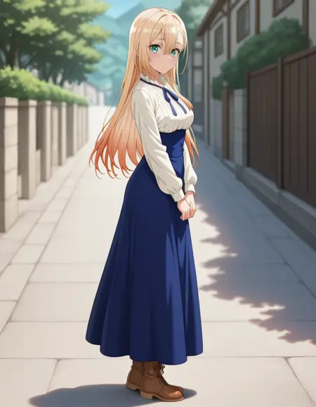 white blouse, blue neck ribbon, long sleeves, blue dress, long dress, cross-laced footwear