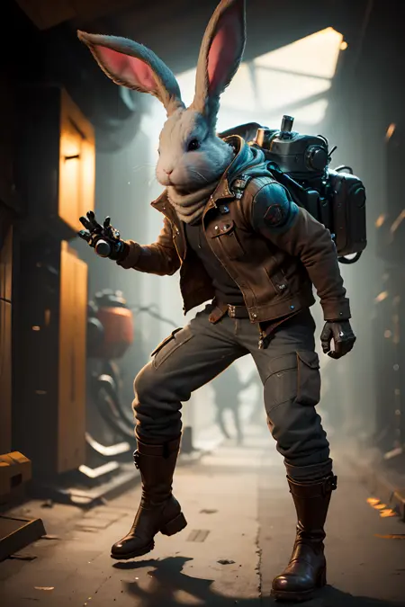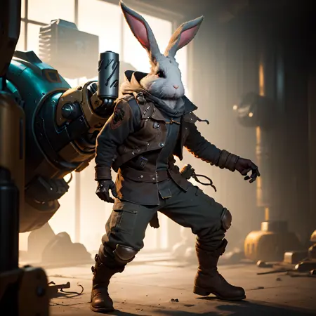 tu,rabbit,jacket,boots,(mechanical arm:1.4),rabbit ears,