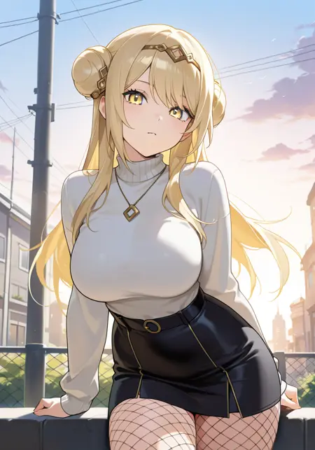 태그: R3sha, 금발, 노랑 눈, 앞머리 아래 원반, 머리 장식, 더블 버ン, 긴 머리, 다색 드레스, 빨간 보석, 가슴 절개, 흰색 소매, 다색 겉옷, 갈색 드레스, 황금 트림, 다색 허벅지 양말, 분리형 소매, 허벅지 부츠