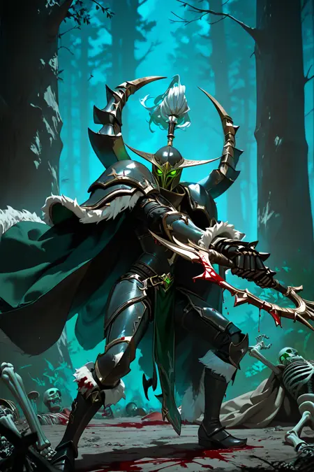 트리거: MaievShad, 꼬리머리, 헬멧, 녹색 눈, 빛나는 눈, 가시가 달린 망토, 장갑, 벨트, 갑옷, 어깨판, 털 장식, 부츠