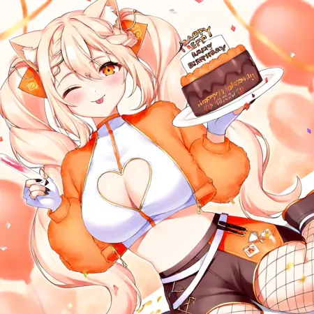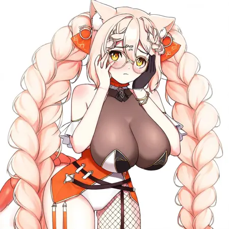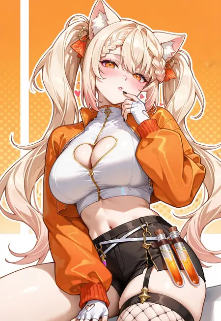 ebikoVtuber, 1girl, 金色头发, 长发, 双马尾, 编织刘海, 橙色眼睛, 脸红, 大乳房, 胸线, 露腹, 橙色夹克, 开襟夹克, 短款夹克, 黑色短裤, 白色衬衫, 短上衣, 长袖, 白色手套, 露指手套, 鱼网过膝袜, 服装镂空, 胸线镂空, 心形镂空, 猫耳, 动物耳朵绒毛, 小瓶, 指甲油, 黑色指甲,