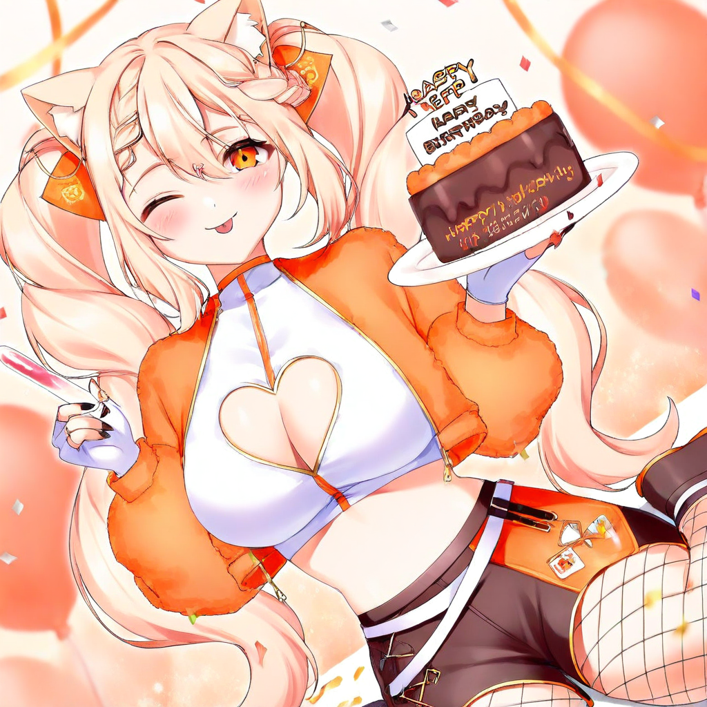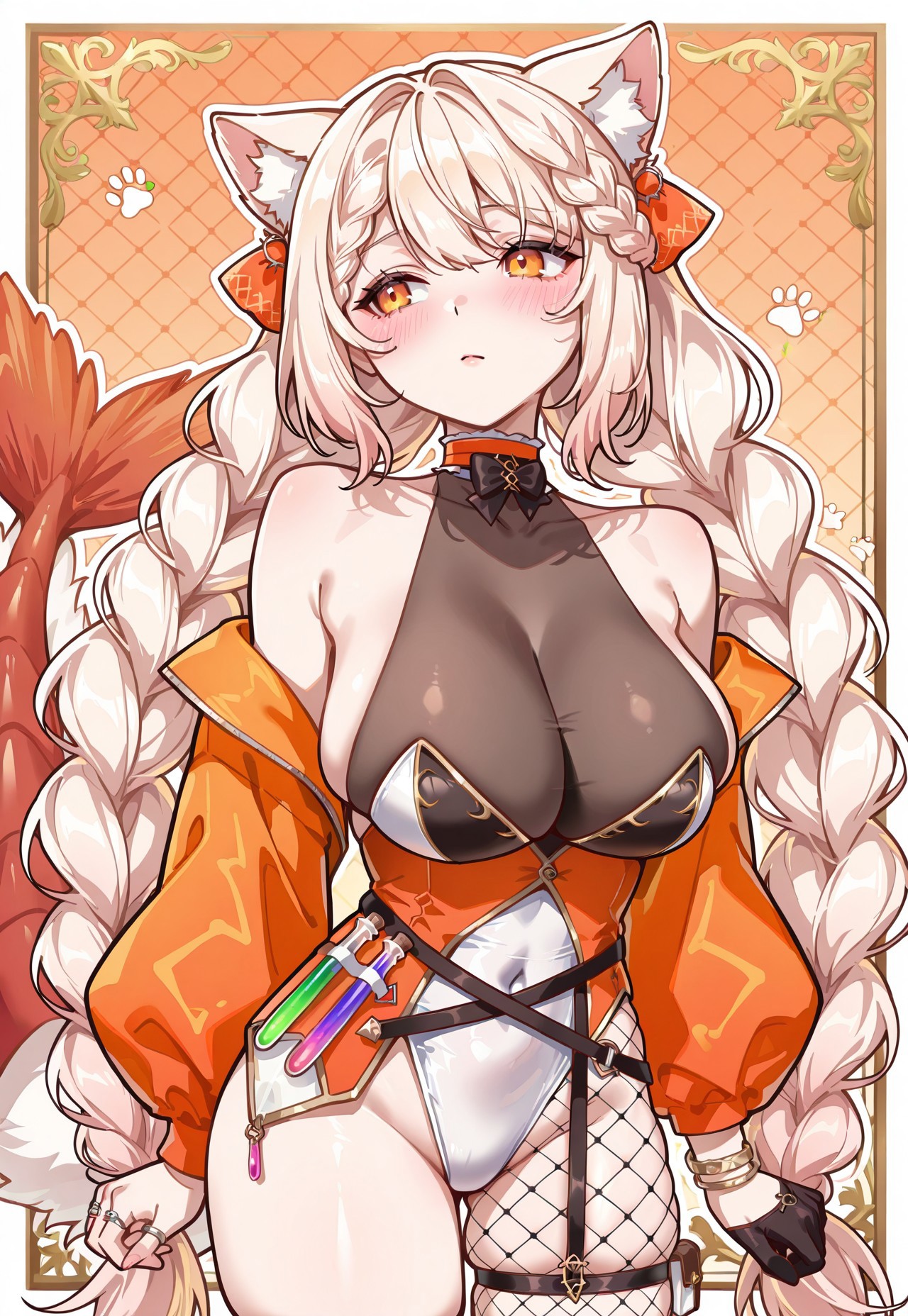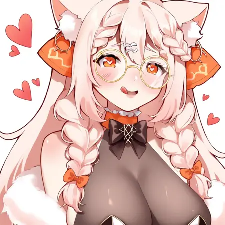 ebikoVtuber, 1girl, 금발 머리, 긴 머리, 트윈테일, 땋은 앞머리, 주황 눈, 볼빨간, 큰 가슴, 가슴선, 복부, 주황 자켓, 열린 자켓, 크롭 자켓, 검은 단축바지, 흰 셔츠, 크롭탑, 긴 소매, 흰 장갑, 손가락 없음 장갑, 피쉬넷 허벅지양말, 옷 컷아웃, 가슴선 컷아웃, 하트 컷아웃, 고양이 귀, 동물 귀 털, 복용병, 네일포인트, 검은 네일,