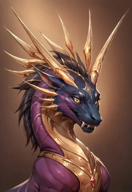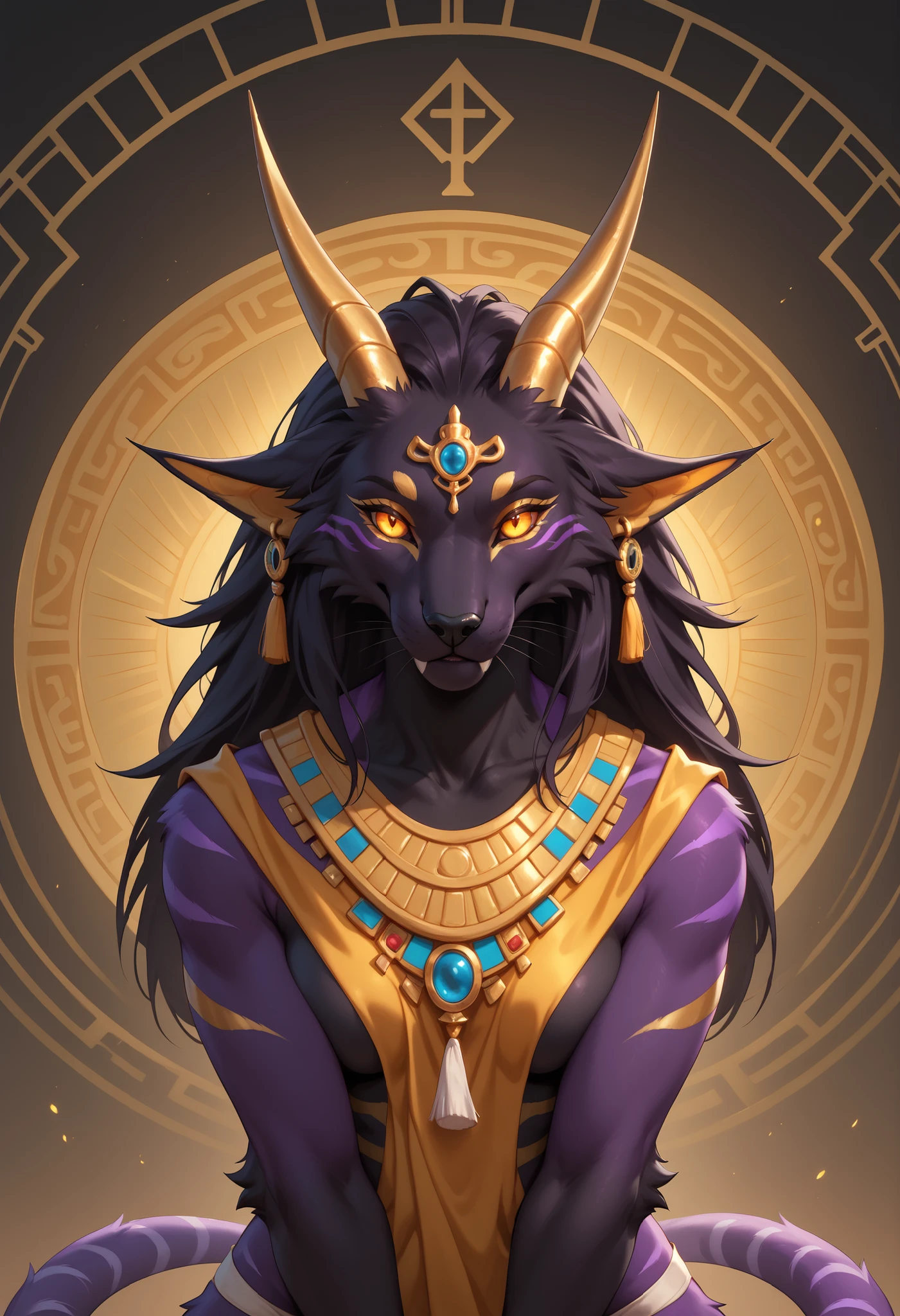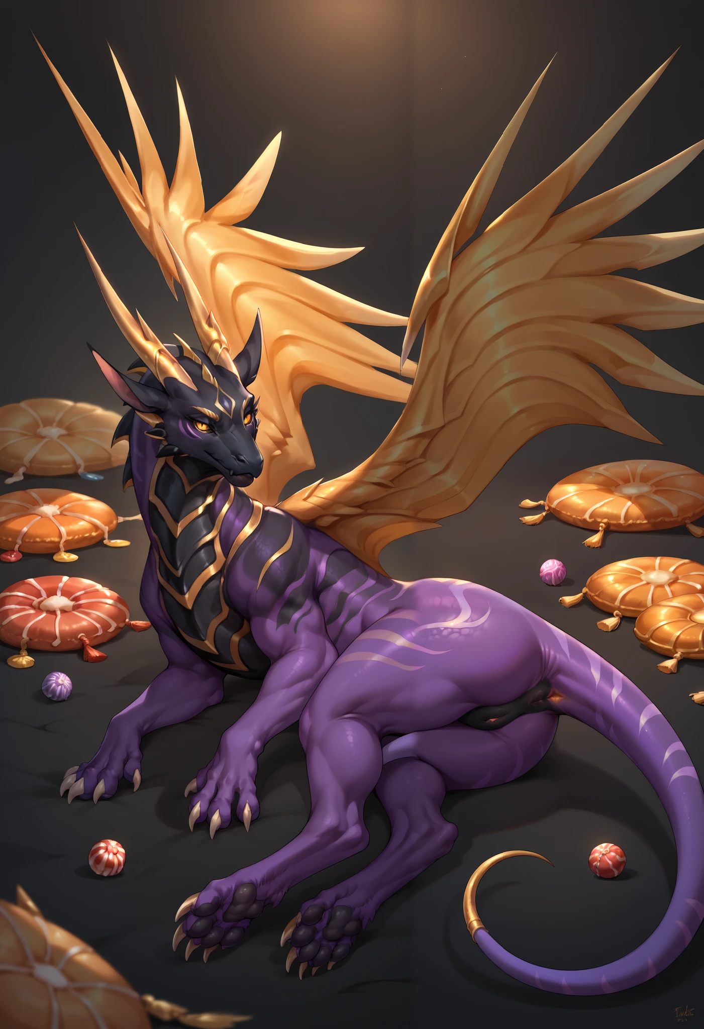 Eothos, dragon, golden mark on forehead, front half of body black with golden stripes, black muzzle, black long black ears, long straight golden horns, golden glowing eyes without pupils, two purple stripes under eyes, golden eyebrows, back half of body purple, front legs orange, hind legs purple, long white claws on paws, long purple tail with white stripes, white tassel at end of tail,