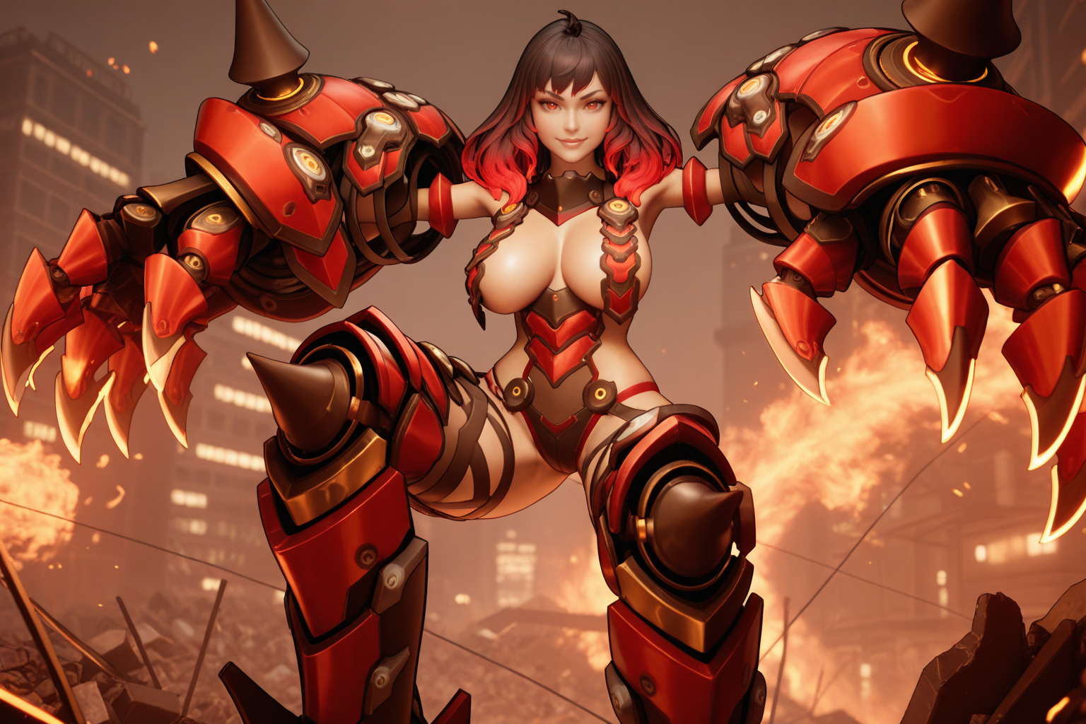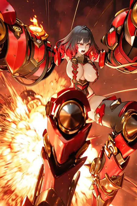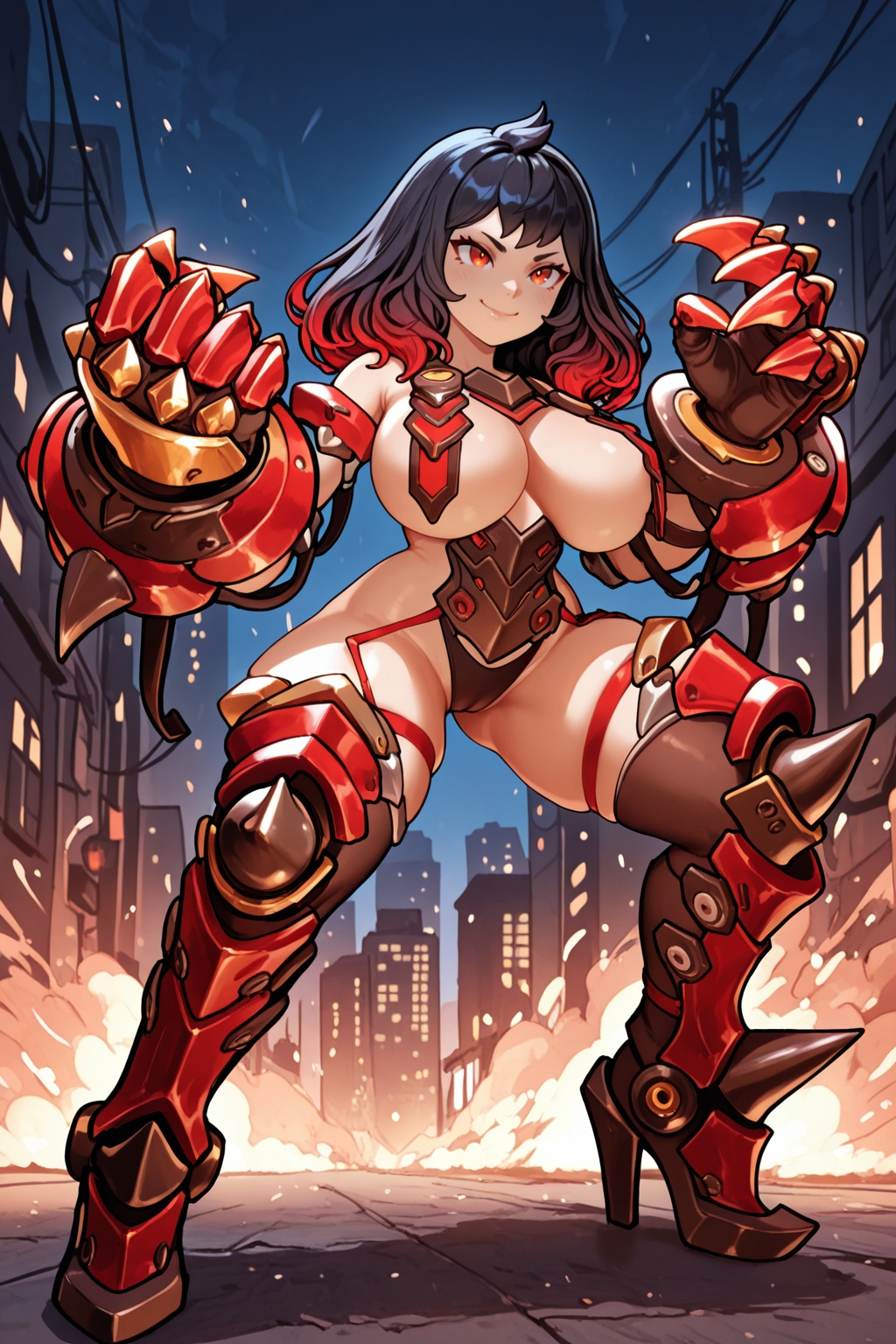 トリガー:kajunchan、ロングヘア、マルチカラーの髪、アーマードカラー、裸の肩、アーマー、メカ娘、バストカーテン、鋭いグローブ、爪、巨大な爪、アンダーブラスト、サイドブラスト、胸元、パンツ、メカニカルブーツ