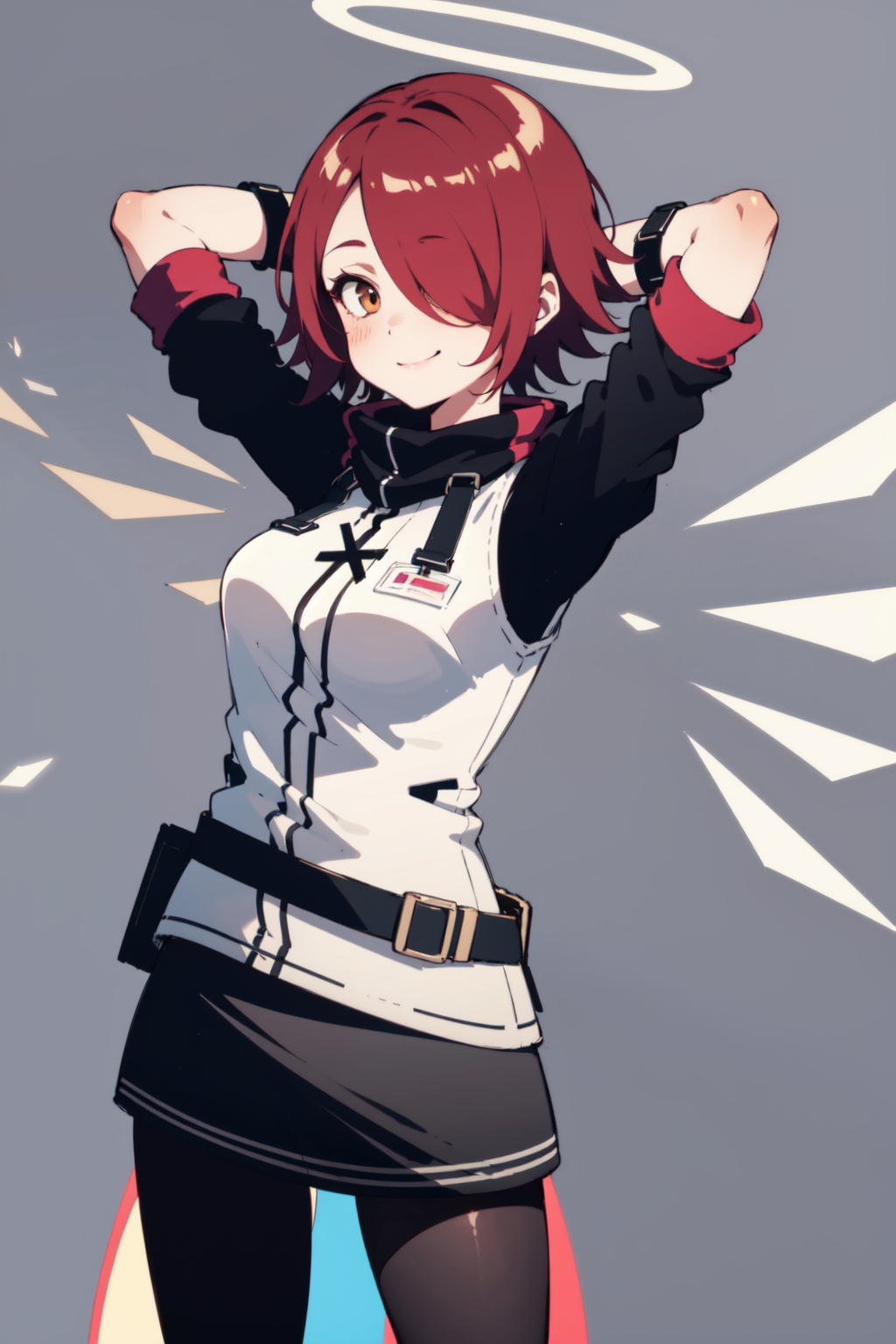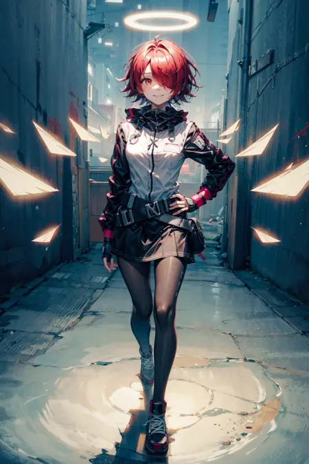 提示词:exusiai,1girl,独奏,红发,短发,棕眼,头发遮住一只眼睛,光环,夹克,腰带,黑色丝袜,分离的翅膀,黑色短裙,露指手套,