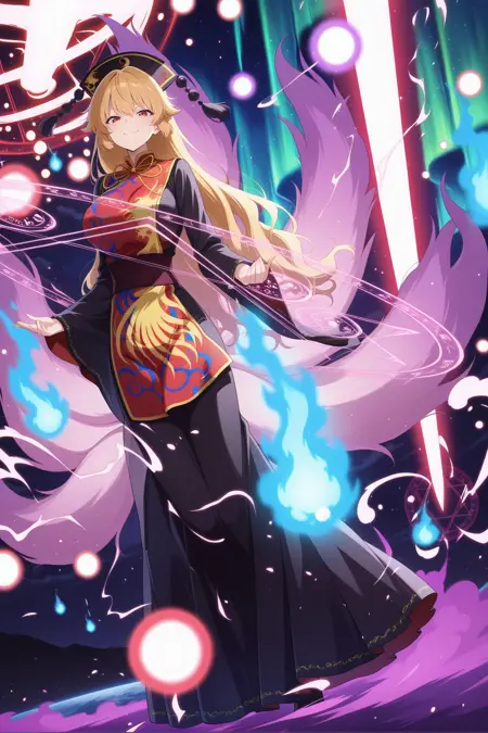 junko, 1girl, solo, red eyes, blonde hair, long hair, wavy hair, hair flaps, multiple tails, fox tail, energy tail, purple tail, aged down,, black hat, dalachi, yellow neck ribbon, mandarine collar, red tabard, phoenix print, black dress, long sleeves, wide sleeves, sleeves past fingers, sash, black shoes,
