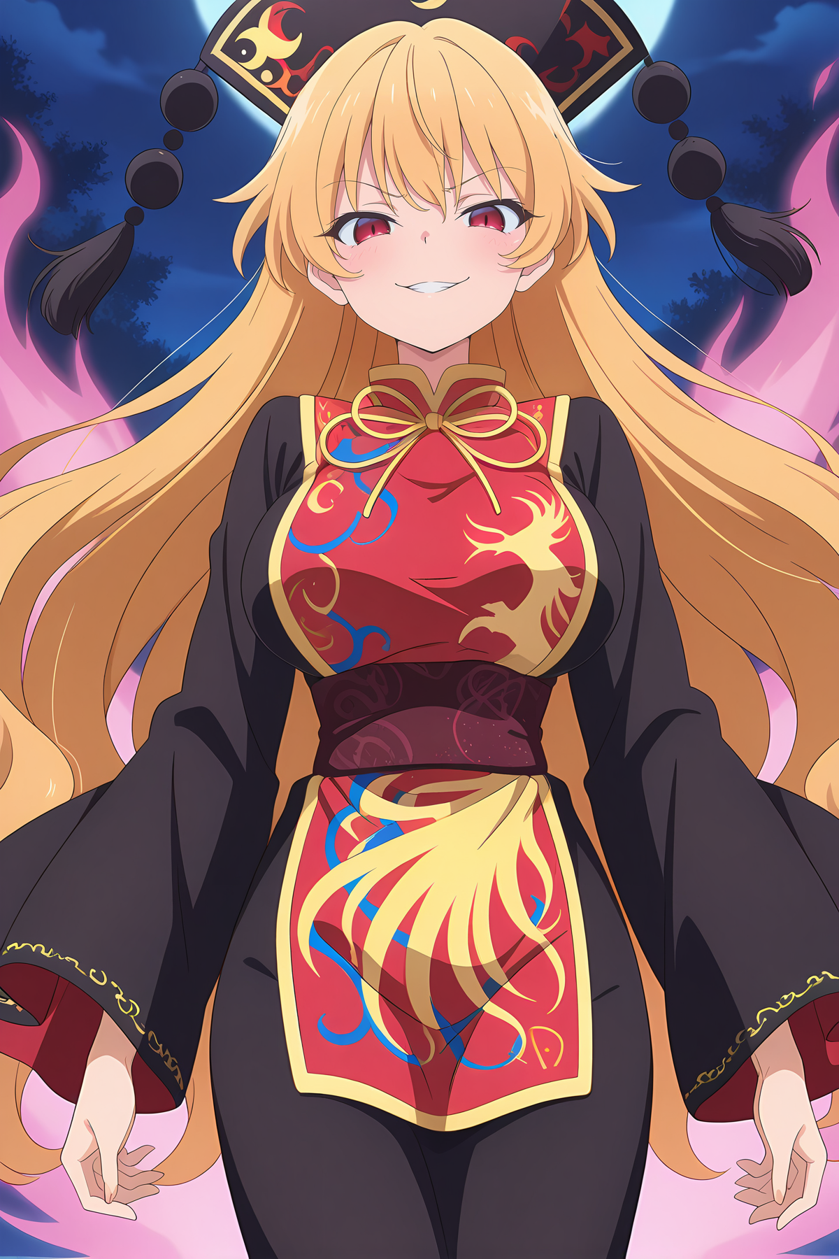 junko, 1girl, solo, red eyes, blonde hair, long hair, wavy hair, hair flaps,