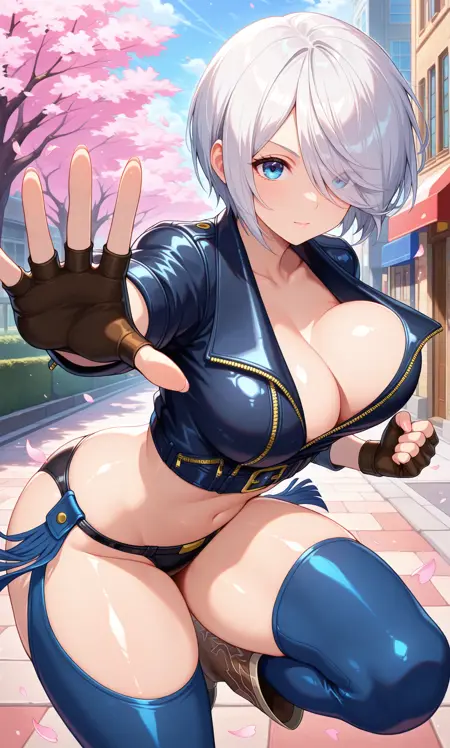 angel (kof), blue eyes, hair over one eye, short hair, white hair