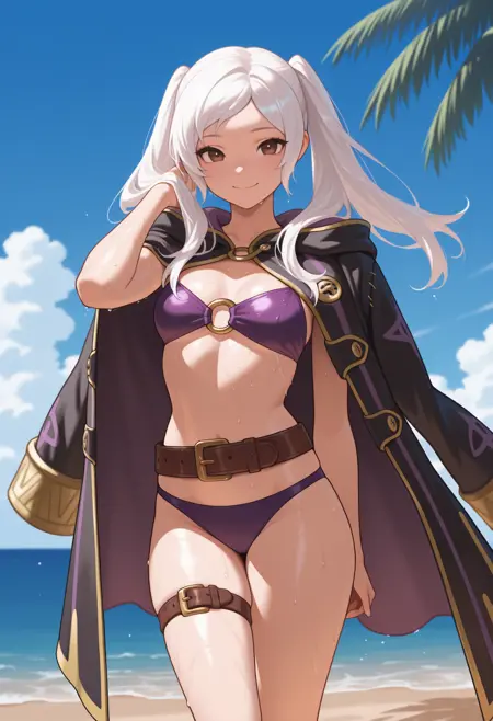 Seaside Tactician: rob1nsummer, long hair, white hair, twintails, brown eyes, black robe, hooded robe, hood down, robe on shoulders, purple bikini, o-ring bikini, multiple belts, brown belt, loose belt, leg belt