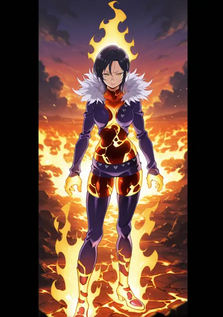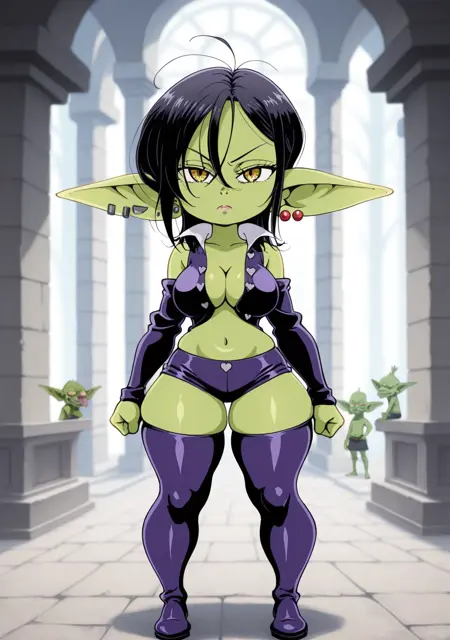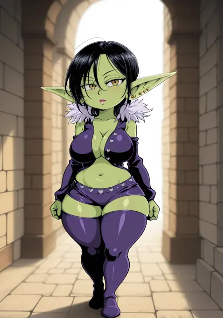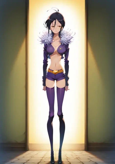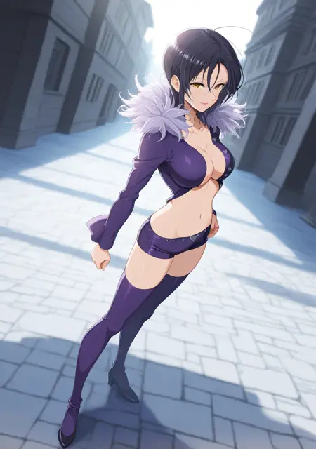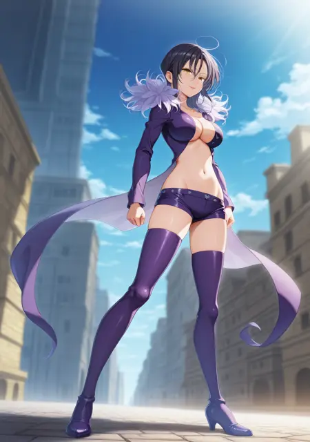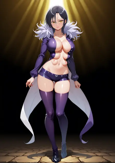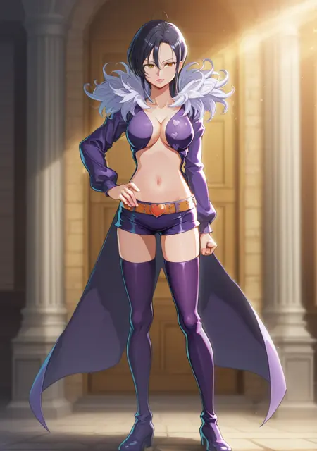 提示词:merlin_7ds, merlin, 7ds, nanatsu no taizai, 黑发, 毛领, 紫色服装, 短裤, 1个女孩, 黑发, 大胸部, 乳沟, 分离袖子, 长筒袜, 黄色眼睛,