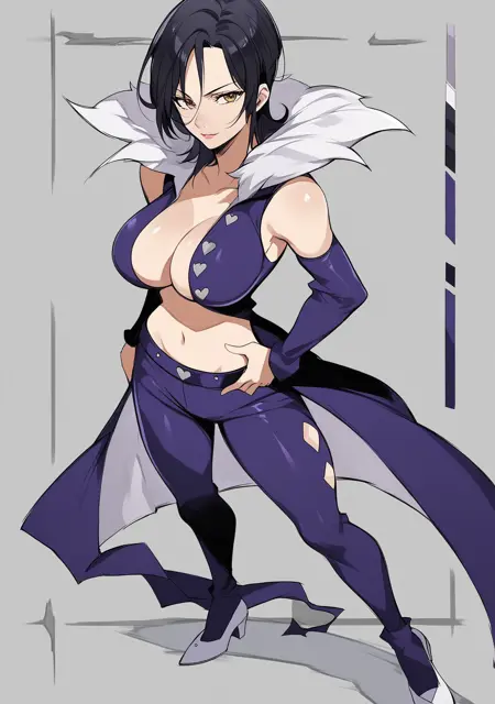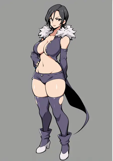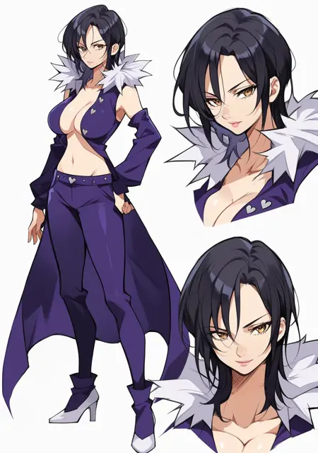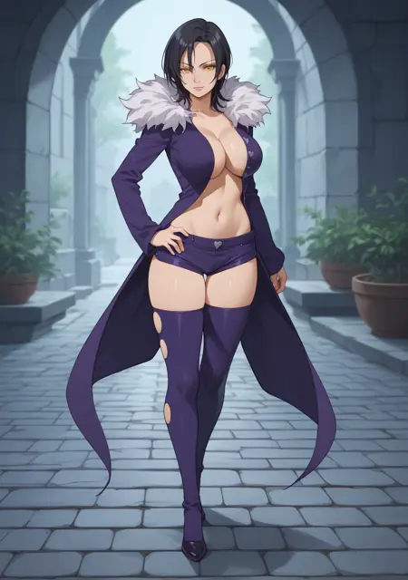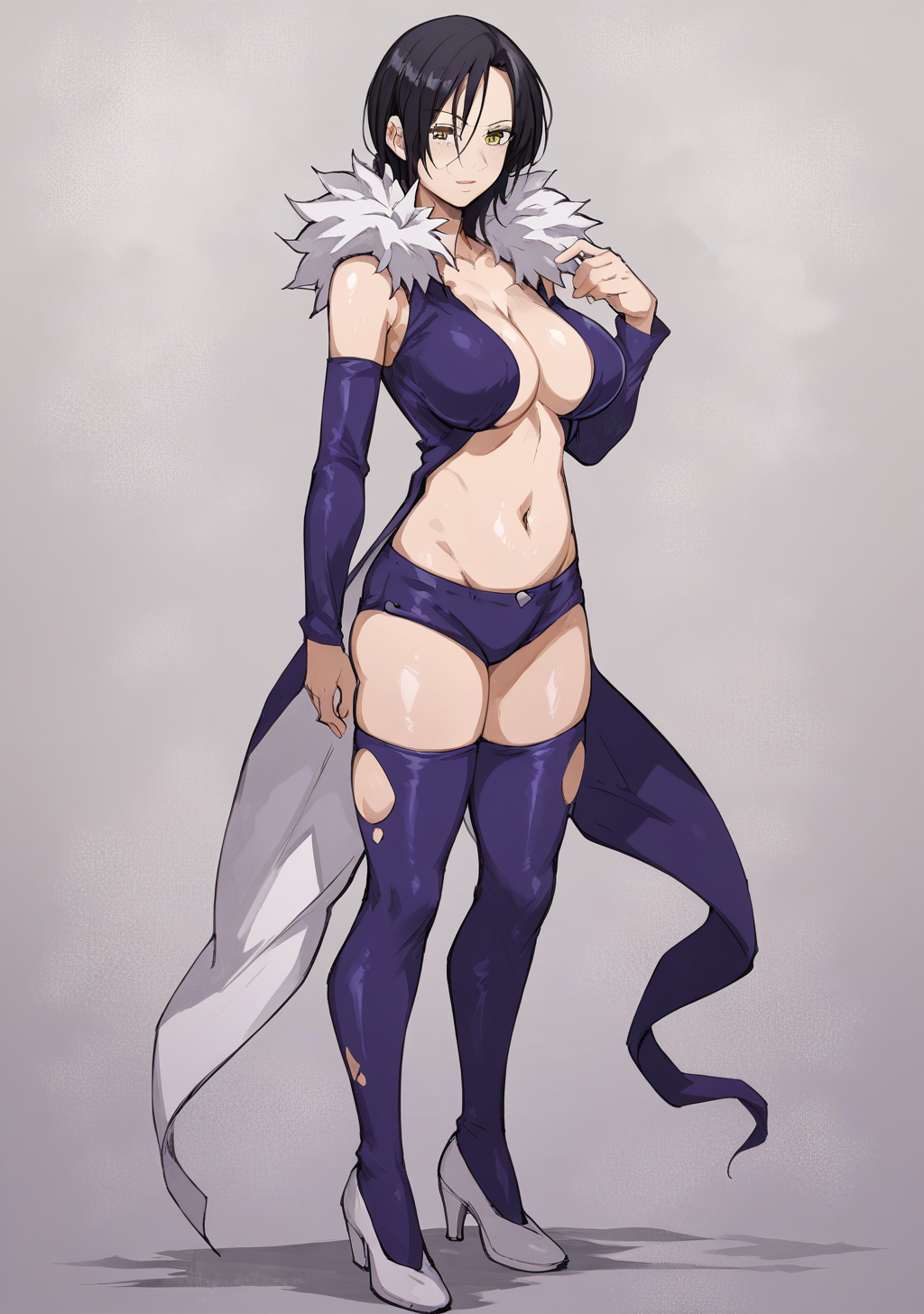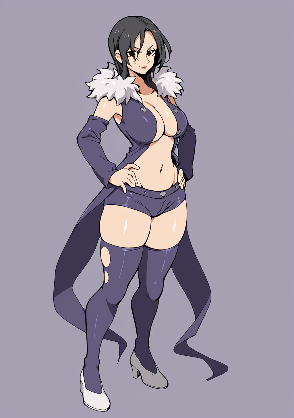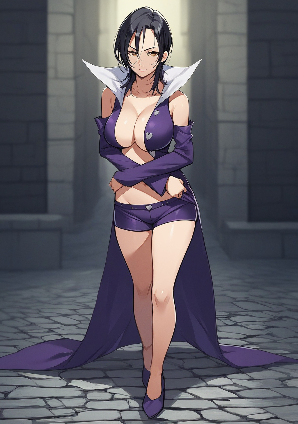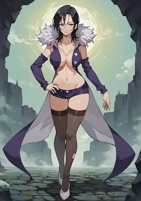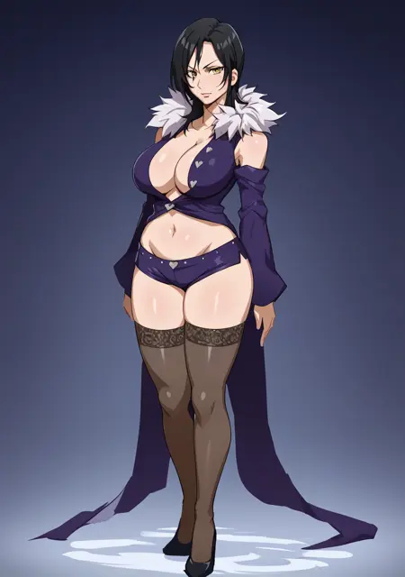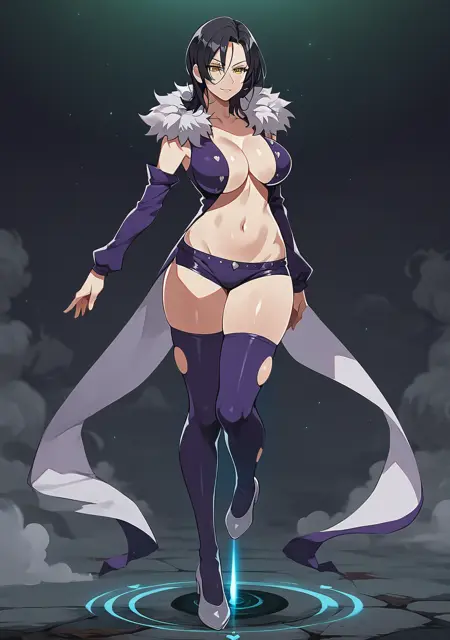 Prompts: merlin_7ds, merlin, 7ds, nanatsu no taizai, dark hair, fur colar, purple outfit, booty shorts, 1girl, black hair, large breasts, cleavage, detached sleeves, stockings, yellow eyes,