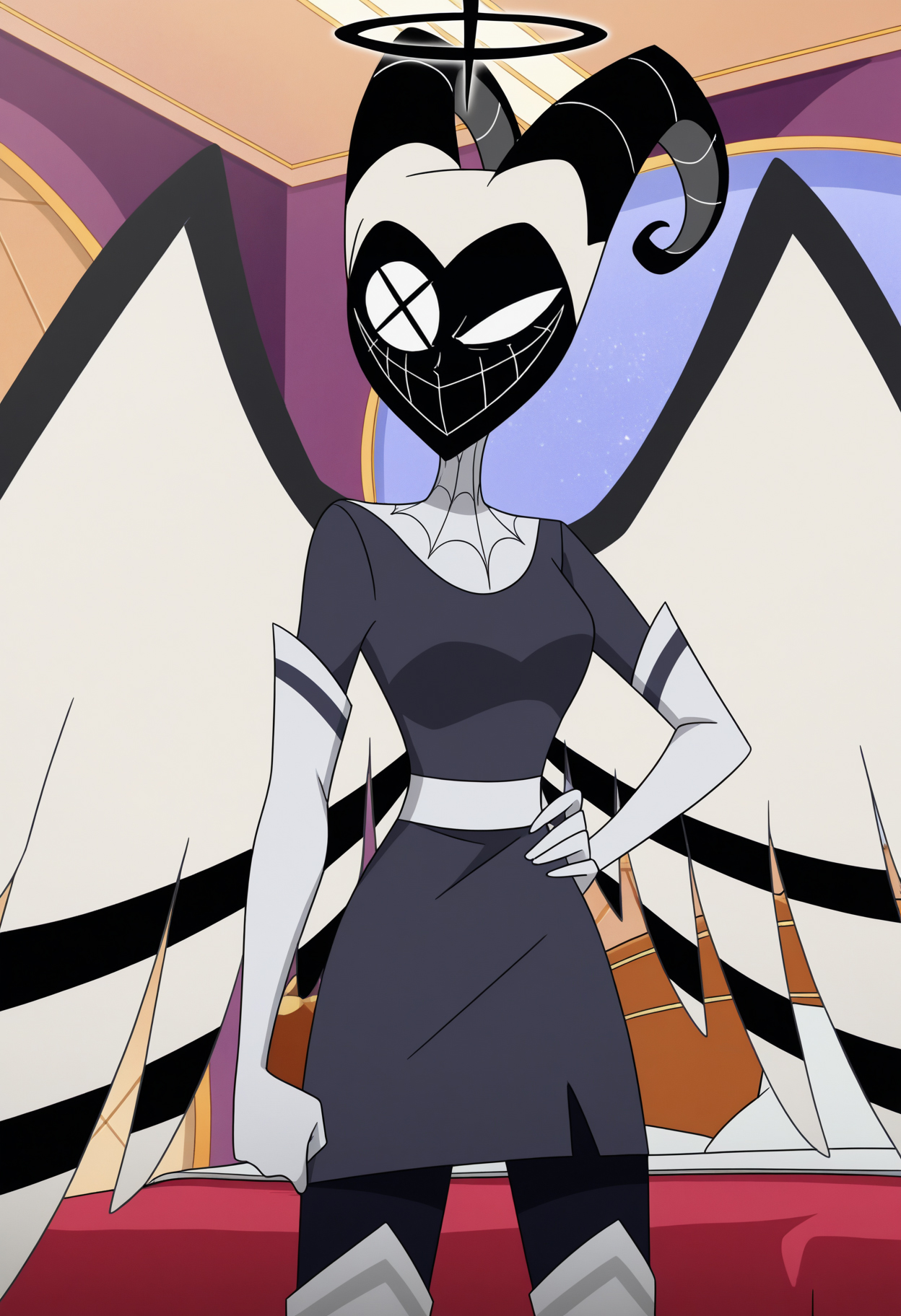 lute \(hazbin hotel\), lute, halo, black halo, angel wings, pale skin, short hair, white hair, white sclera, yellow eyes