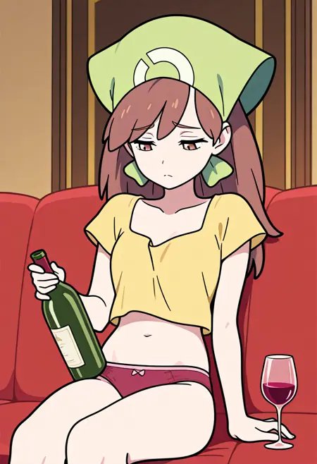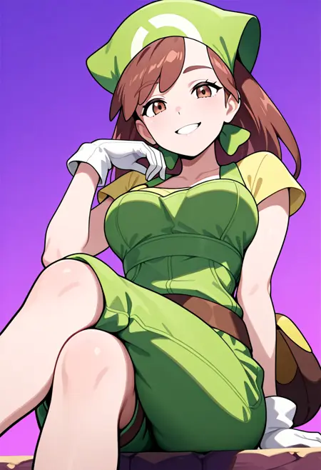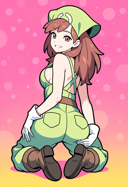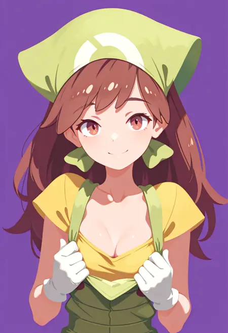 키워드는 xybr3eder이며, 기본 옷차림은: 녹색 머리장식, 오버올, 노란색 셔츠, 흰장갑, 허리가방, 부츠