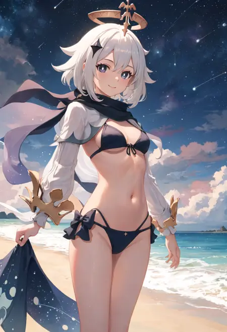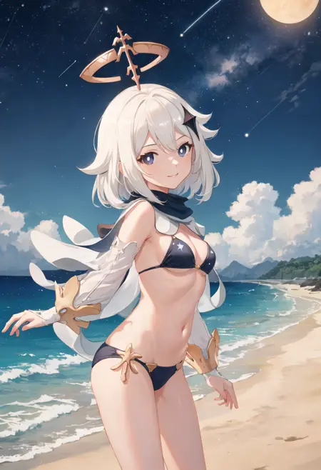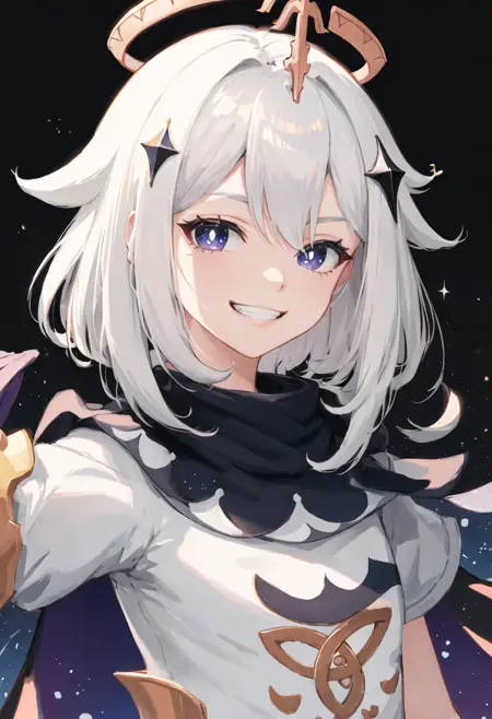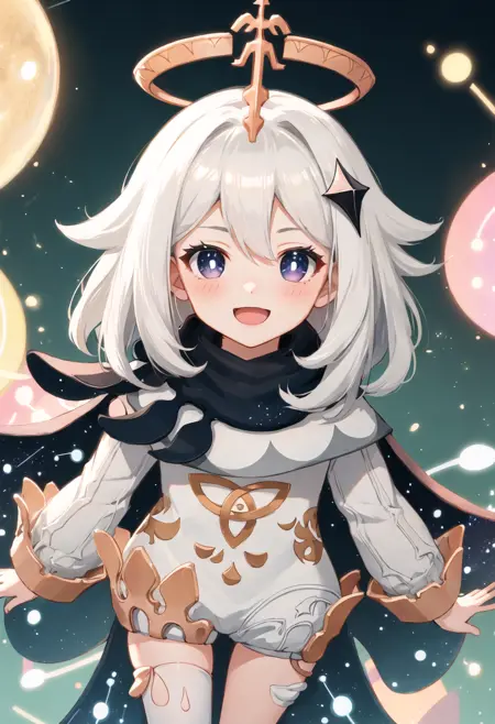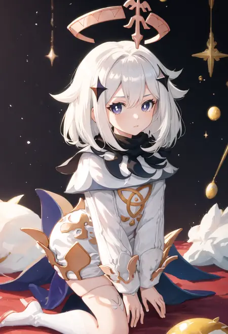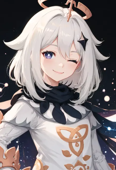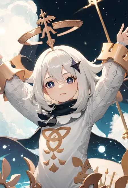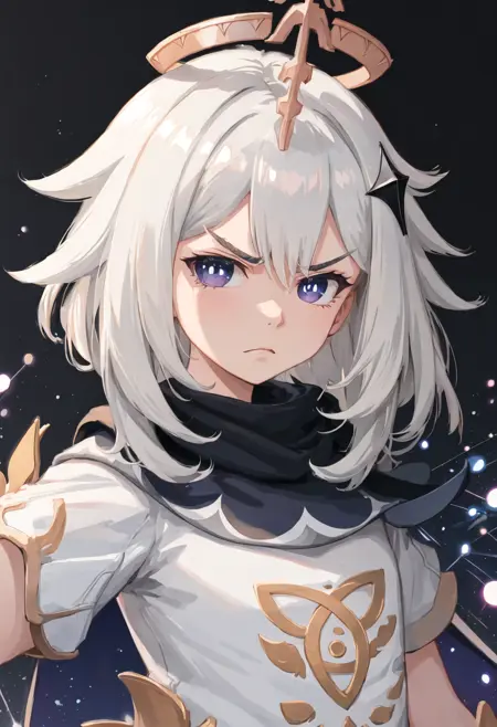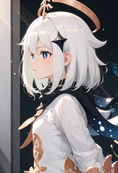 white_hair,halo,hair_ornament,hair_between_eyes,blue_eyes,bangs,short_hairです。キャラクターの主要な特徴(例:髪の色)が安定しない場合、これらのタグをプロンプトに追加してください。 - ptファイルのおすすめ重みは0.7–1.1、LoRAの重みは0.5–0.85です。