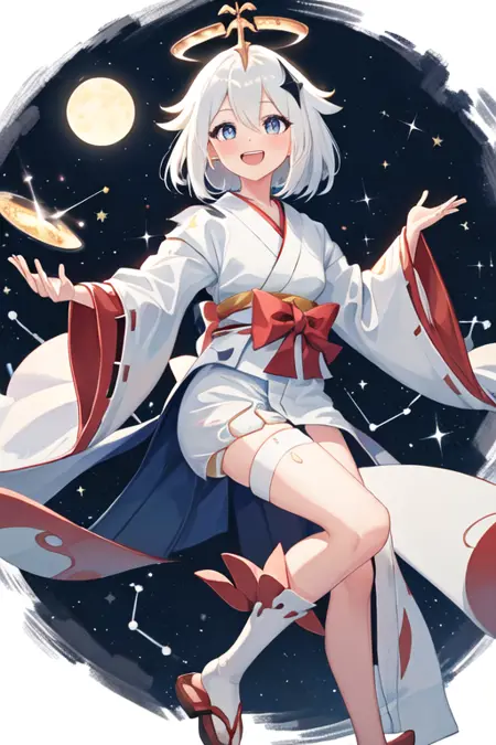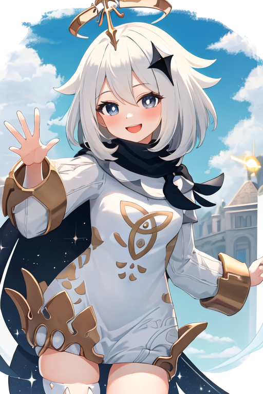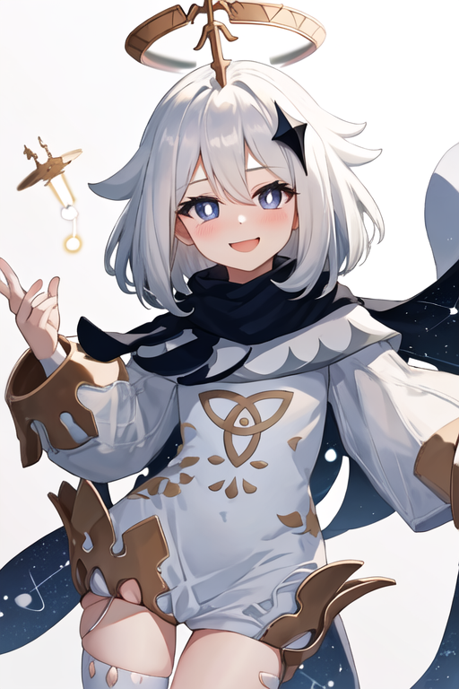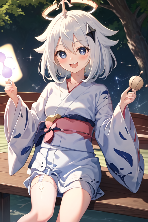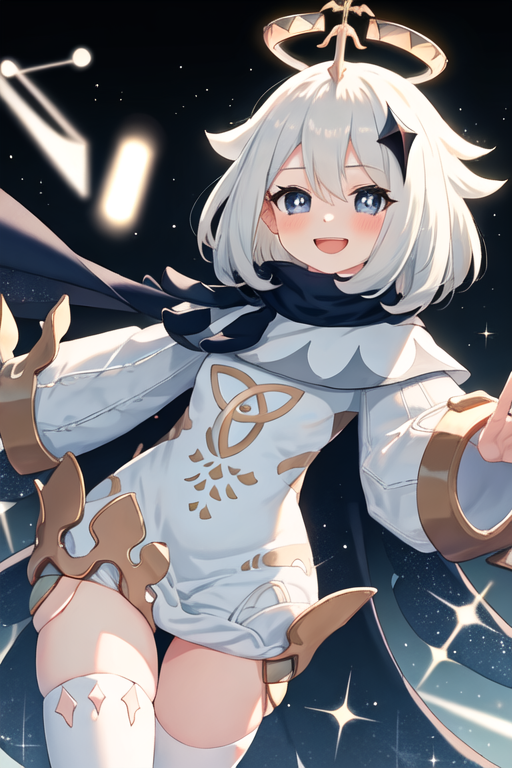 触发词为 paimon_genshin,精简标签为 white_hair, halo, hair_ornament, hair_between_eyes, blue_eyes, bangs, short_hair。当某些特征(如发色)在某些时候不够稳定时,您可以将这些标签添加到提示词中。