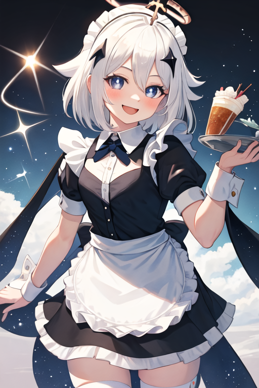 - 精简后的角色标签为:white_hair、halo、hair_ornament、hair_between_eyes、blue_eyes、bangs、short_hair。当角色的核心特征(如发色)不够稳定时,您可以在提示词中加入这些标签。