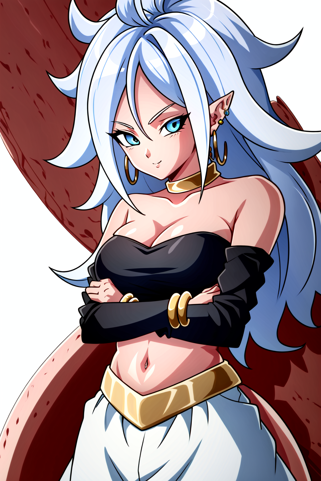 마진 안드로이드 21(악): android 21, 검은 공막, 가슴, 색상 있는 공막, 분홍색 피부, 보석, 빨간 눈, 가슴선, 검은 손톱, 긴 머리, 귀걸이, 색상 있는 피부, 뾰족한 귀, 팔찌, 환형 귀걸이, 네일폴리시, 흰색 머리, 미소, 큰 가슴, 어깨 노출, 중간 크기 가슴, 스트랩리스