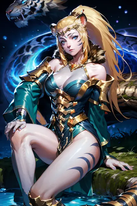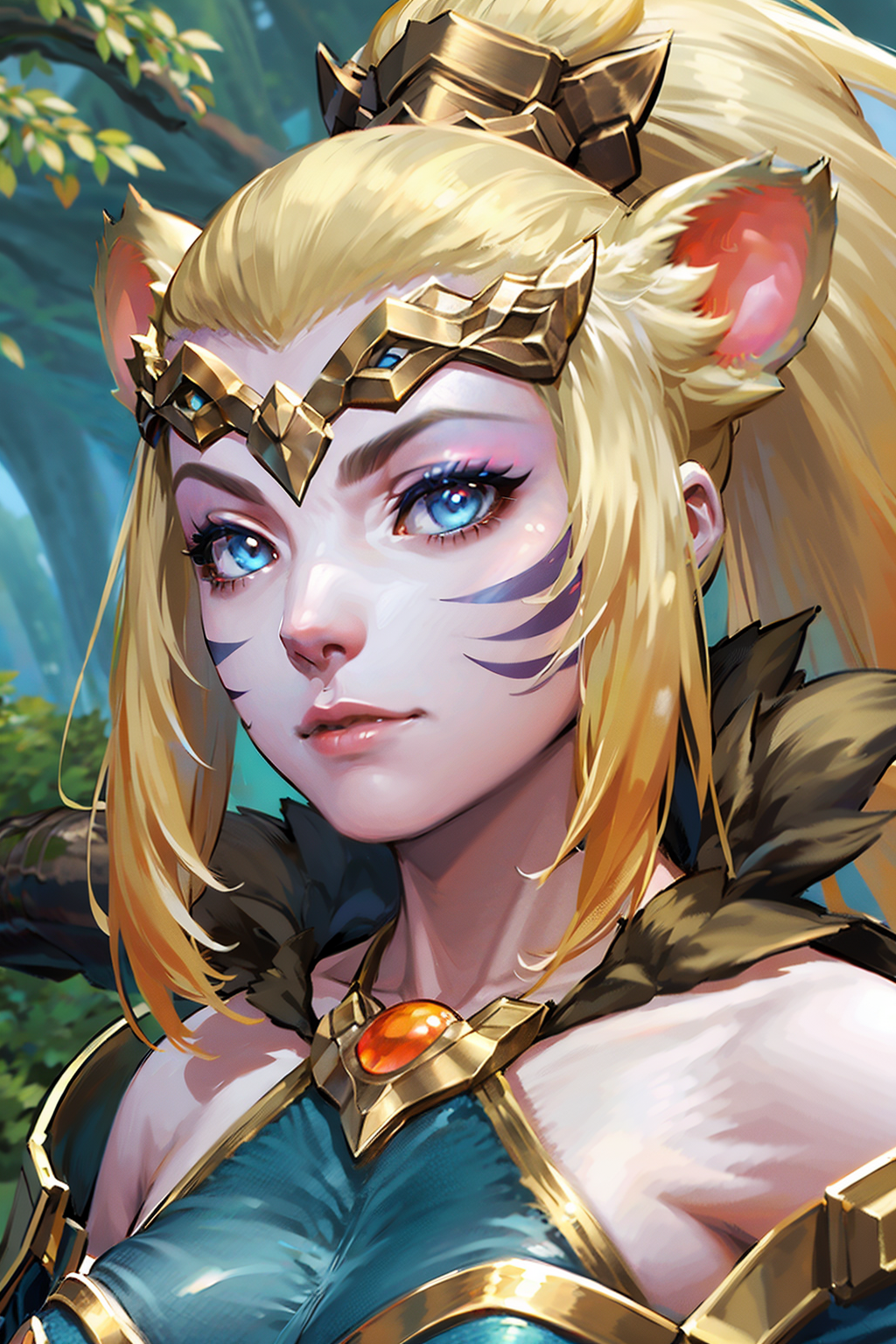 プロンプト: Arum_Default, 1girl, long hair, very long hair, blonde hair, animal ears, looking at viewer, blue eyes, facial mark, nose, lips, bare shoulders, breasts, large breasts, armor, alternate costume, jewelry, bracelet, colored skin, blue skin, portrait, tiger girl