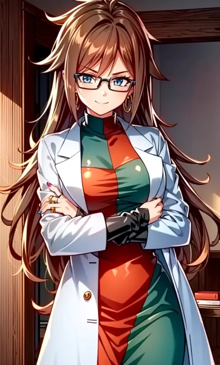 Android 21, Vomi, 1girl, android 21, jewelry, solo, glasses, earrings, long hair, labcoat, dress, checkered clothes, hoop earrings, brown hair, ring, checkered dress, blue eyes, breasts, looking at viewer, medium breasts, curly hair