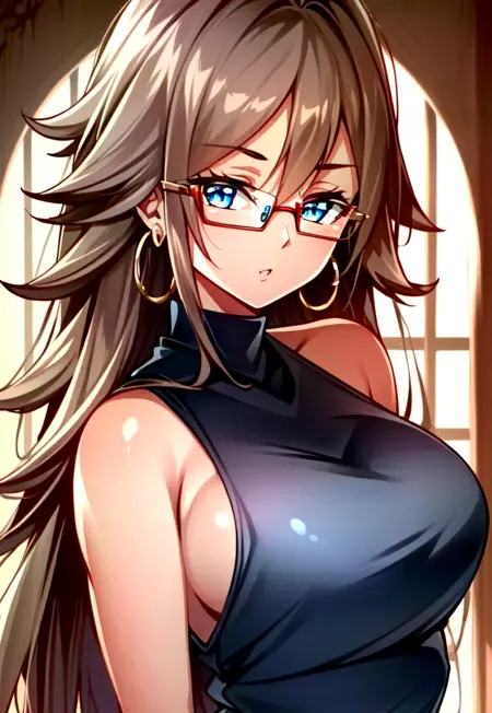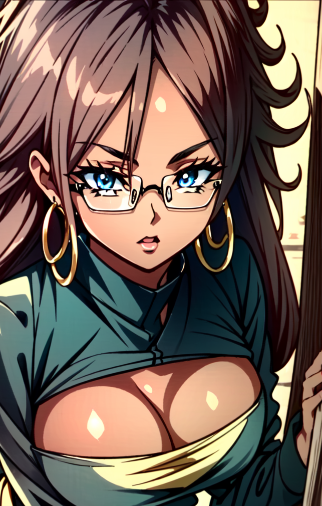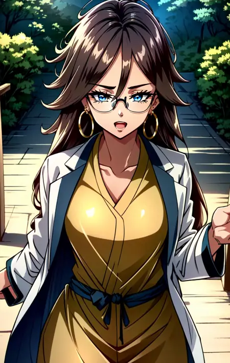 Android 21, Vomi, 1girl, android 21, jewelry, solo, glasses, earrings, long hair, labcoat, dress, checkered clothes, hoop earrings, brown hair, ring, checkered dress, blue eyes, breasts, looking at viewer, medium breasts, curly hair