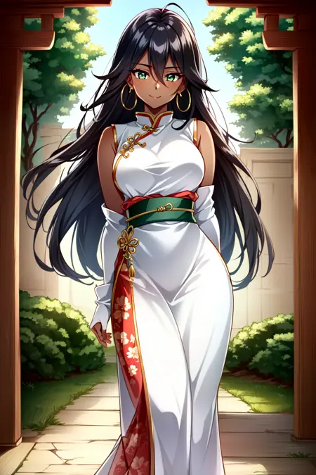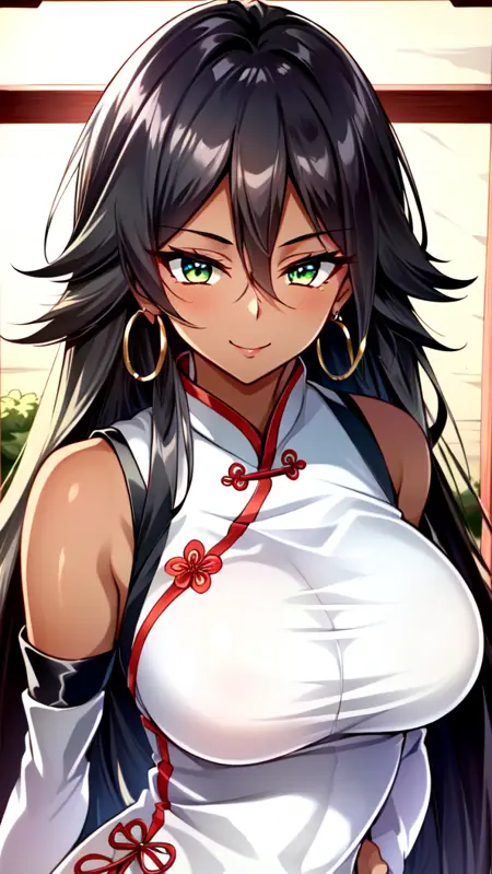 Majin Android 21 (Good): android 21, breasts, pink skin, jewelry, cleavage, blue eyes, long hair, earrings, smile, colored skin, hoop earrings, pointy ears, white hair, bare shoulders, medium breasts, detached sleeves, choker, hair between eyes, strapless