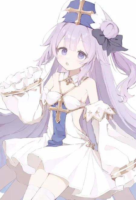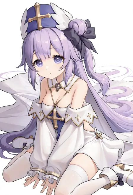 guardianangel, hair bow,white collar,white dress,white sleeves,long sleeves,white thighhighs,mitre,cape,high heels