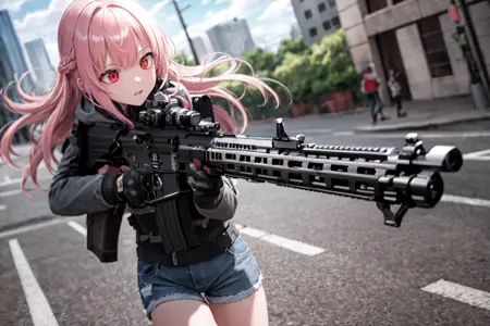 "holding weapon, assault rifle, aiming at viewer" のようなタグを使用すると、人物のポージングもさらに自然になります。
