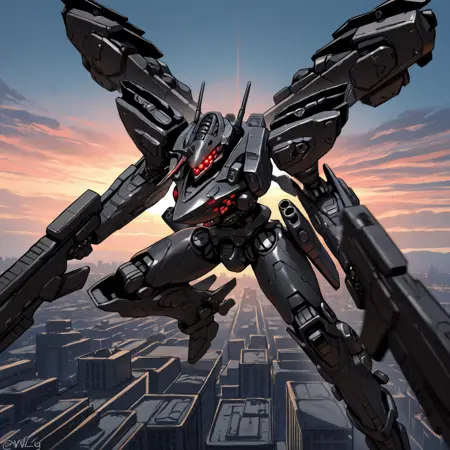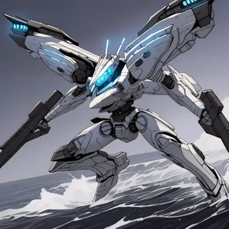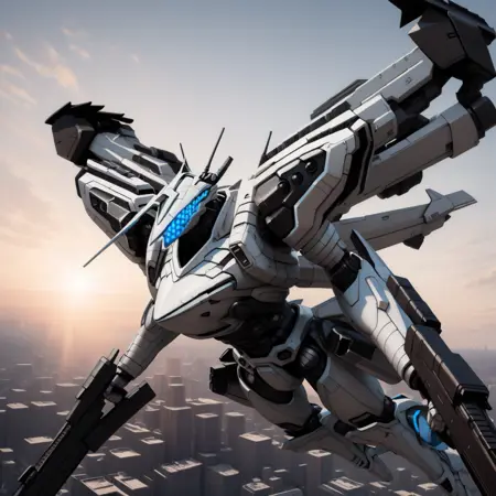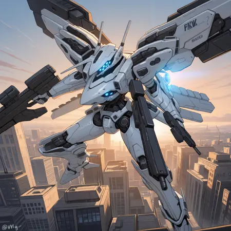 外見タグ: 白いメカ、白いロボット、片角、ラジオアンテナ、アサルトビーサー、青いビーサー、青い目、光る目、追加の目、機械的翼、スラスター