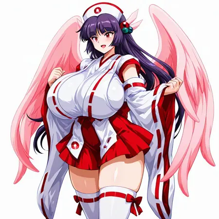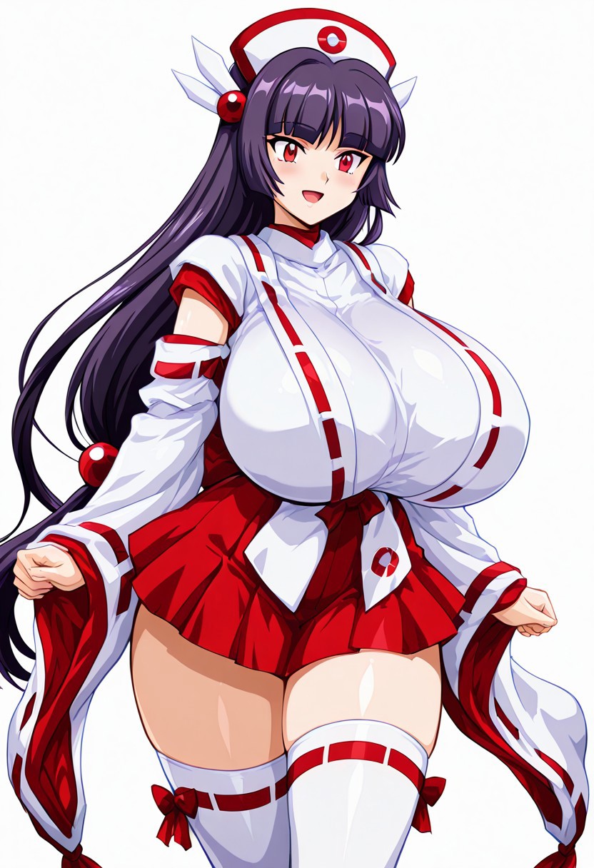 태그: 일본 복장, 하카마, 미코, 빨간 하카마, 하카마 단축 치마, 리본 장식 소매, 젯타이 루오키, 흰색 허벅지 양말, 머리 장식, 헤어밴드, 분리형 소매, 리본 장식, 비전통적 미코, 넓은 소매, 마법의 소녀, 간호사 모자, 타비,