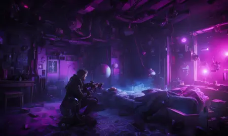 spnj 스타일, 빛나는 조명이 있는 SF 환경 속의 사람의 스크린샷