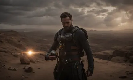 spnj 스타일, 검을 들고 배경에 하늘이 있는 사람의 컴퓨터 생성 이미지