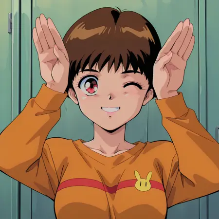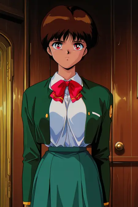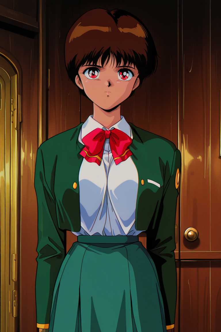 トリガー語と推奨プロンプト:MaoSeiden2025IL, 1girl, スリムなボディ, 短髪, 茶色の髪, 茶色がかった赤い目, 胸, レトロなアートスタイル, レトロなアニメセルシェーディング, 1990年代 \(スタイル\), 緑のスカート, 緑のジャケット, 白いシャツ, 赤いリボン,