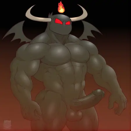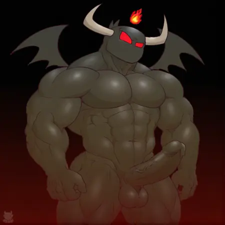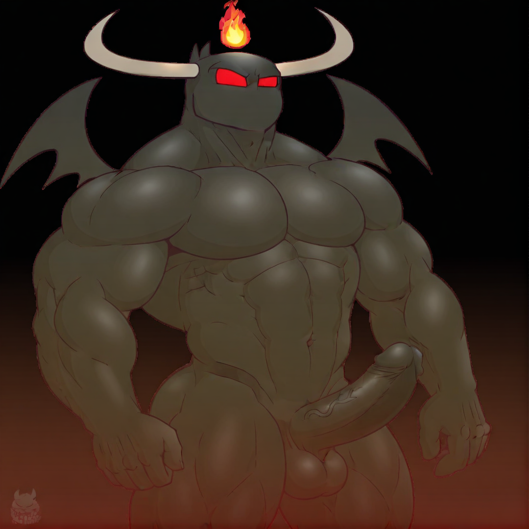 <lora:grim:1>, grim, horns, red eyes, demon, wings, solo, male, black skin, muscular, bara, black penis, balls, fire