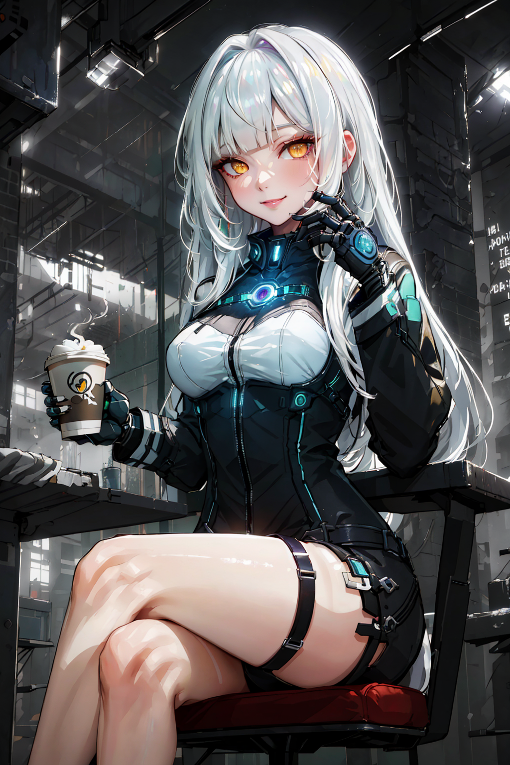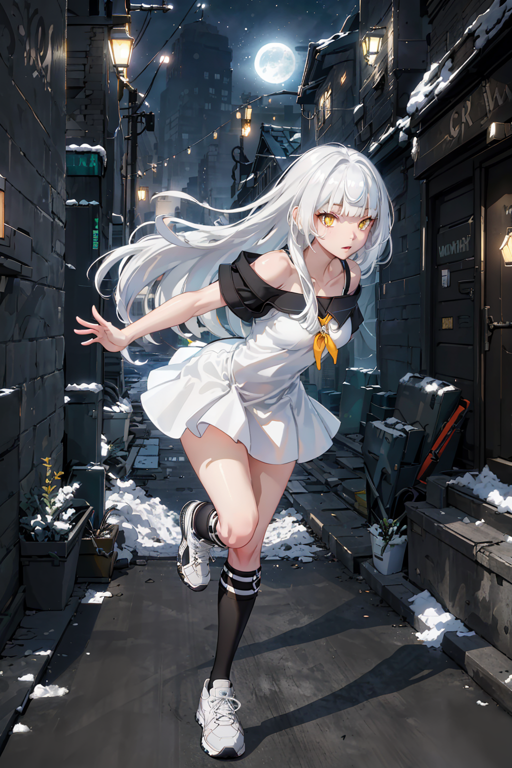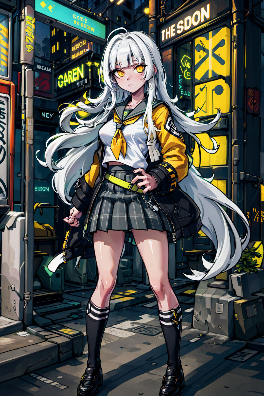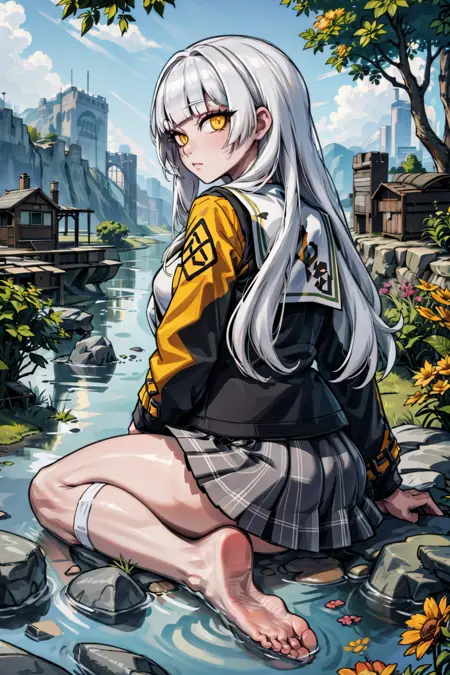 rio、白髪、長い髪、ストレートな前髪、黄色い目、中程度の胸