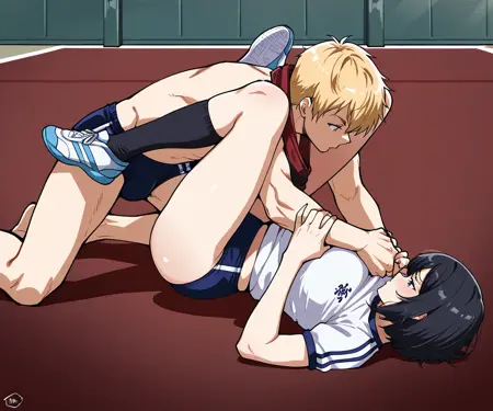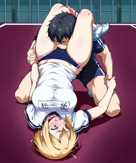masterpiece,best quality,amazing quality, prespective long shot, trichoke++, SideViewChoke, closeupSideVew, 1girl, 1boy, black hair, hetero, buruma, blonde hair, short hair, gym uniform,leg wrapped around the neck++,Armgrabbing+