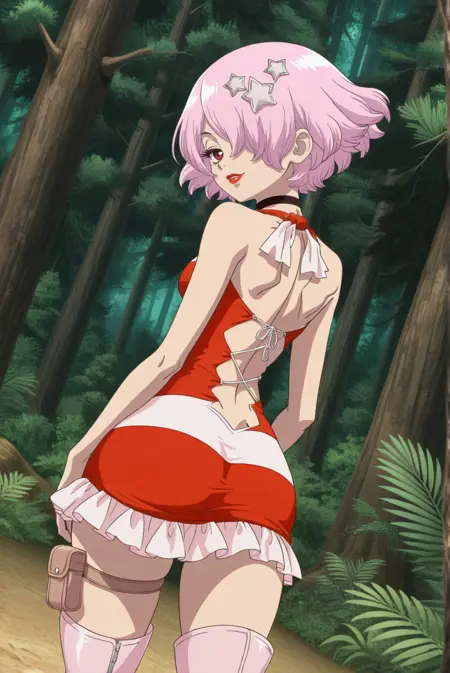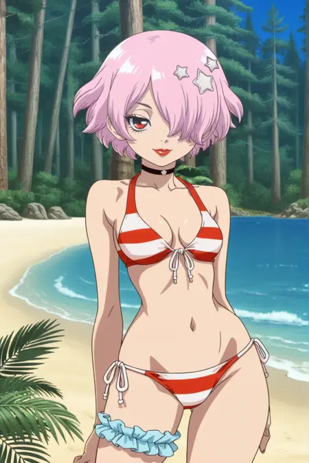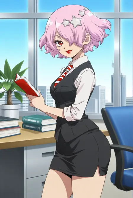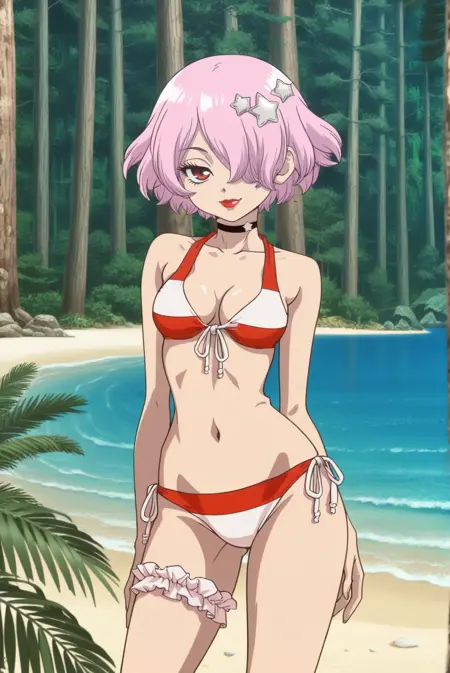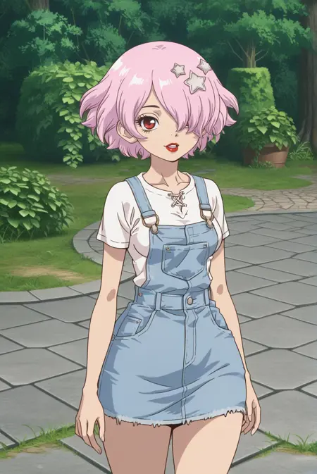 <lora:LunaWright-IL-v1-08:1.0>, ChopioLuna, 短い髪, ピンクの髪, 星の髪飾り, 片方の目に髪がかかる, 赤い目, 睫毛, 赤い唇, 視聴者を見つめる,
