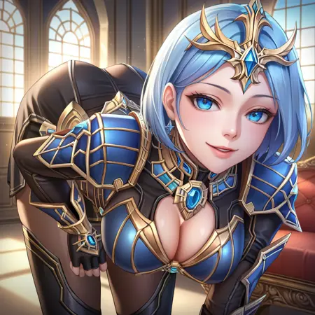 CSO_Aetheris, 1girl, solo, blue eyes, breasts, blue hair, short hair, armor, cleavage, high heels, large breasts, fingerless gloves, gloves, boots