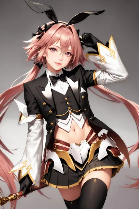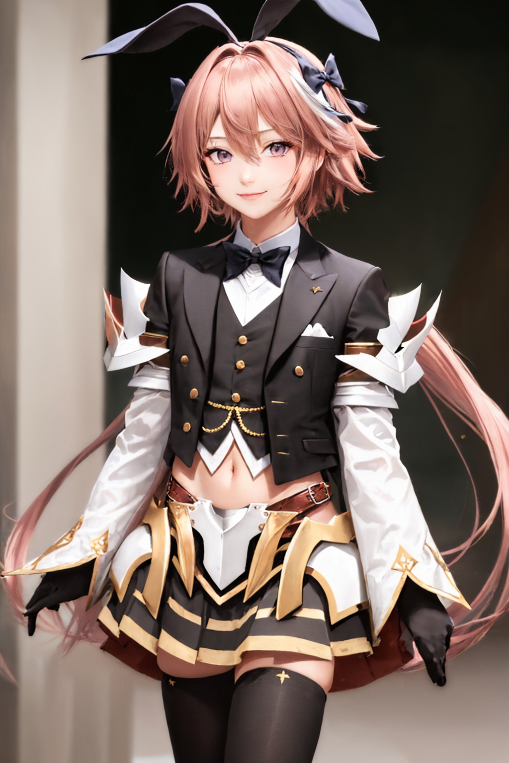 ステージ2: astolfost2, hair bow, hair ribbon, buttons, wing collar, black bowtie, long sleeves, black gloves, skirt, black thighhighs, midriff