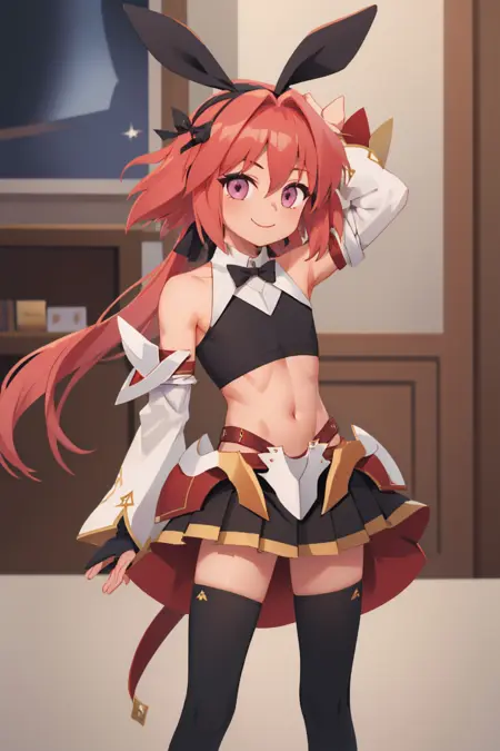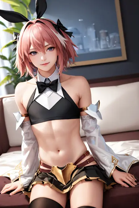 ステージ1: astolfost1, hair bow, hair ribbon, crop top, black bowtie, detached sleeves, black skirt, black thighhighs, bare shoulders, midriff