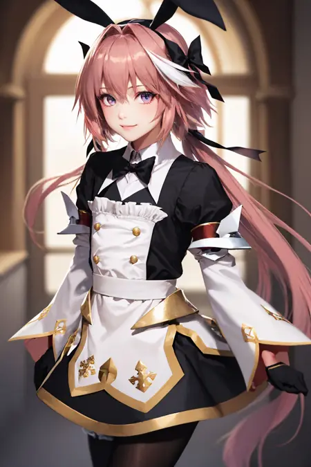 Stage 2: astolfost2, hair bow, hair ribbon, buttons, wing collar, black bowtie, long sleeves, black gloves, skirt, black thighhighs, midriff