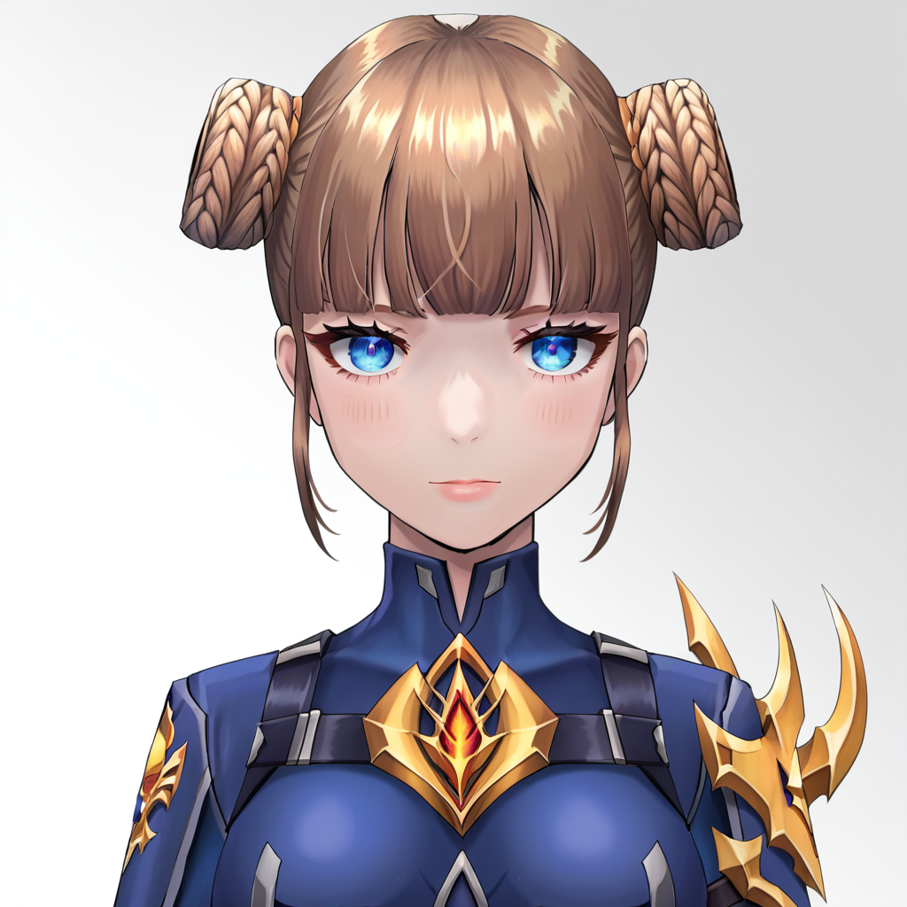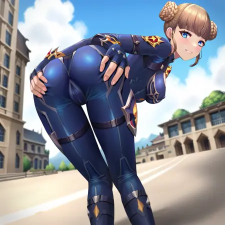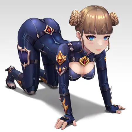 CSO_DDK, 1girl, solo, blue eyes, medium breasts, hair bun, brown hair, double bun, bodysuit, claws, boots, braid, high heels, fingerless gloves