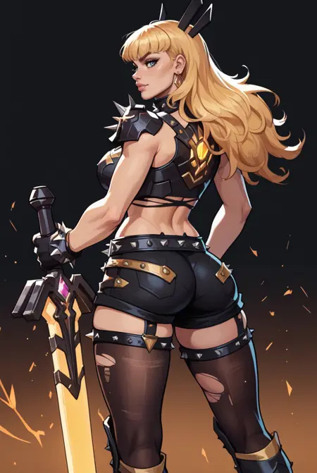 | Trained Words | long hair, wavy hair, thick bangs, golden hair, black armored outfit, crop top, spiked shoulder armor, fingerless gloves, black shorts, studded belt, ripped black stockings, thigh-high armored boots, spiked knee guardsCopied! holding weapon, holding sword, black and gold weapon, angular hilt, ornate hilt, glowing golden sword, oversized weapon, glowing golden bladeCopied! |