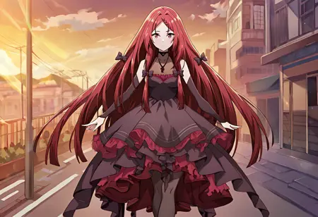 1girl, elisabeth2, solo, very long hair, elisred5 dress, elisred5 necklace, elisred5 detached sleeves, elisred5 hair bow, elisred5 pantyhose, elisred5 high heels, parasol, holding parasol,