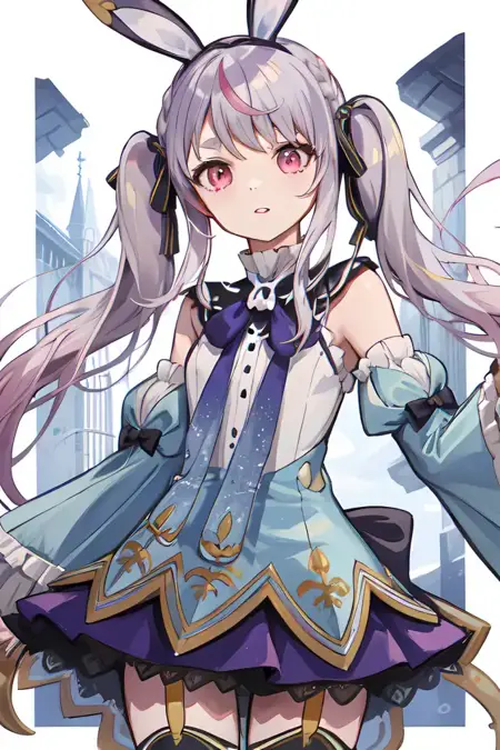 ドレスの服装:tosaki mimi, mimi second, twintails, braids, detached sleeves, fake animal ears, rabbit ears, dress, black thighhighs