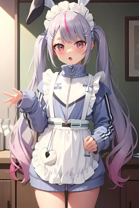 メイドの服装:tosaki mimi, mimi pastel, twintails, long hair, maid headdress, rabbit ears, fake animal ears, hairclip, apron, track jacket